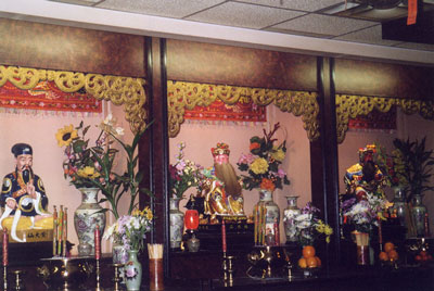During the course of our research we visited the Centre D'Étude on five separate occasions. It took several meetings before suspicions over our presence were quelled, enabling us to gather any information about the activities and purpose of the temple. The temple-staff, regularly limited by time constraints, had little time or desire to attend to our inquiries. This temple serves a very inclusive and specific community and need not open itself to outsiders nor present itself as an attractive spiritual alternative to Montrealers at large. As a result, our contact could not, or would not, provide information about rituals, rites and doctrine. We therefore, had to rely on our general observations. This task was impeded by the absence -- other than on our visit during the New Year celebrations -- of individuals practicing within the ritual space. What struck this researcher as the most fascinating aspect of this institution was the adherents' devotion to the Empress of Heaven as their own personal saviour figure. The members of this community of Vietnamese Boat People believe they have witnessed the miracles of this traditional deity in the modern age. They continue to pay homage to her acts of mercy and compassion and have erected this temple in her name, transplanting popular Asian culture to downtown Montreal. Acknowledgements I would like to thank Beatrice Recio, my research partner for the last three months. I would also like to thank the Centre D'Étude des Religions et Croyances de la Chine a Montréal, Canada for their time and help. I would particularly like to thank Mr. Diep who met with us on several occasions and provided us with the information regarding the temple found in this report. References Works CitedBinh D Dao, "The Legacy . . .Remains . . ." Vietnamese Boat People Connection. Online. Internet. 25 March. 2002. Available: www.boatpeople.com Danielle Dugas, "Leaving Vietnam." Canadian Museum of Civilization Corporation. (Nov 1998, July 2001) Online. Internet. 25 March. 2002. Available: www.civilization.ca/culture/vietnam/vican01e.html Matthias Eder, Chinese Religion, Asian Folklore Studies Monograph no. 6 (Tokyo 1973). David Crockett Graham, Folk Religion in Southwest China (Washington: Smithsonian Press, 1961). Christian Jochim, Chinese Religions: A Cultural Perspective (New Jersey: Prentice Hall, Inc., 1986). David K. Jordan, Gods, Ghosts and Ancestors: The Folk Religion of a Taiwanese Village (Berkeley: California UP, 1972). Vivian-Lee Nyitray, "Becoming the Empress of Heaven: The Life and Bureaucratic Career of Mazu" from Goddesses Who Rule, ed. Elisabeth Benard and Beverly Moon (New York: Oxford UP, 2000) 165-180. John Shryock, The Temples of Anking and Their Cults: A Study of Modern Chinese Religion (New York: AMS Press Inc., 1973). Laurence G. Thompson, Chinese Religion: An Introduction, 5th ed. (California: Wadsworth Publishing Company, 1996). "Vietnamese Boat People." Migration News. Vol. 3, No. 9. (May 1996) Online. Internet. 25 March. 2002. Available: http://migration.ucdavis.edu/mn/archive_mn/may_1996-15mn.html List of Photographs Figure 1: Pamphlet from Centre D'Étude des Religions et Croyances de la Chine à Montréal, Canada Figure 2-6: Courtesy of Beatrice Recio Figure 7: Laurence G. Thompson, Chinese Religion: An Introduction, 5th ed. (California: Wadsworth Publishing Company, 1996) 54. | |||||||||||||||||||||||||||||||||||||||||||||||||||||||||||